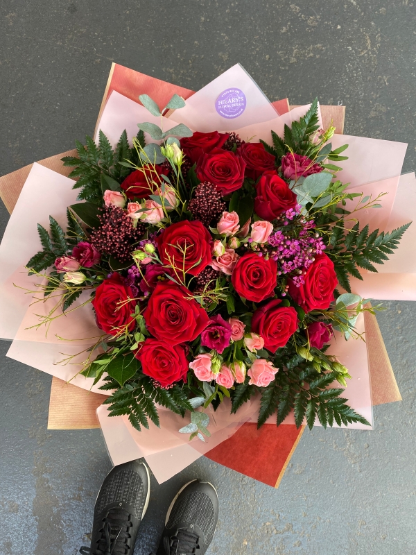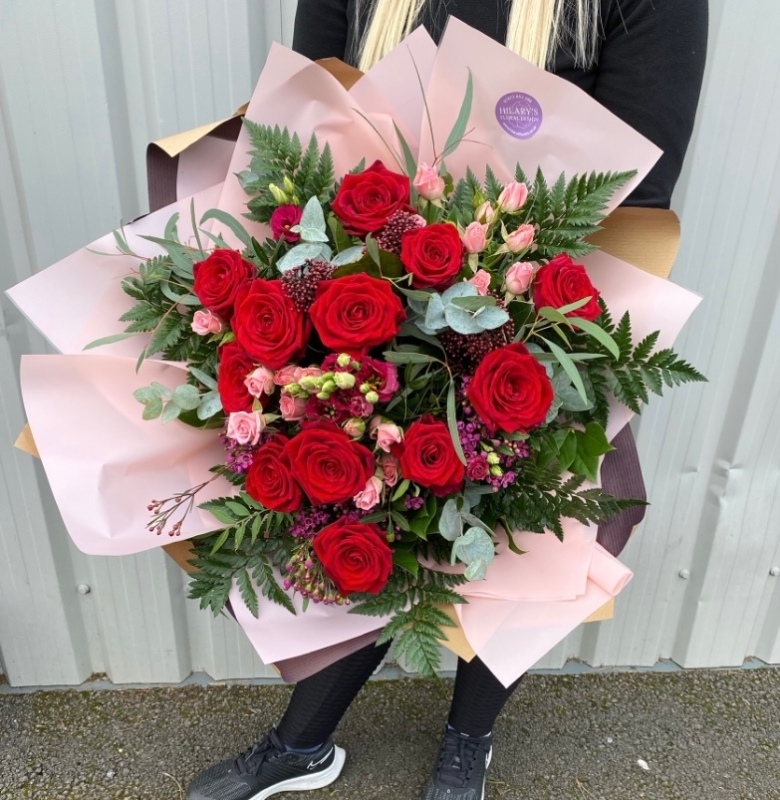 Our Welsh Beauty, is a pretty mix of 12 deep red roses mixed with seasonal pink flowers and delicate foliages
