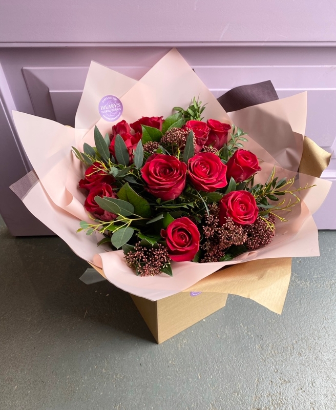 12 beautiful red roses with foliage, the classic Valentines mix.