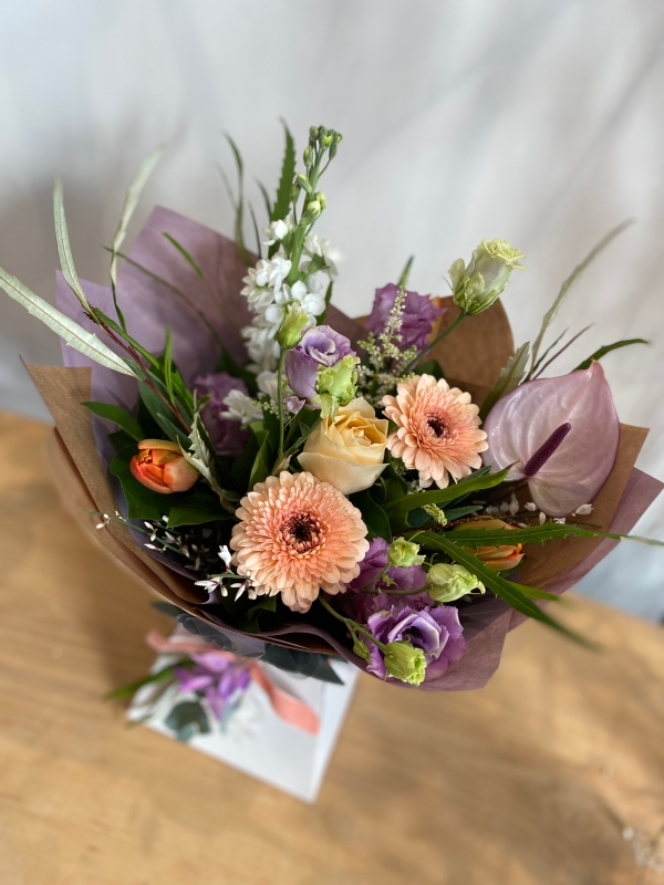 Our smaller gift box of fresh flowers and foliages in a delicate mix of whites, lilacs and peach flowers, finished off with a ribbon and dried flower tie.