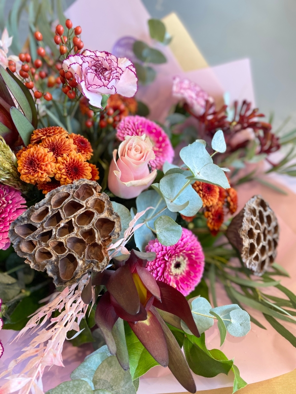 The Gingerbread Bouquet is a festive blend of orange, pink, and red seasonal blooms with lush seasonal foliage.
