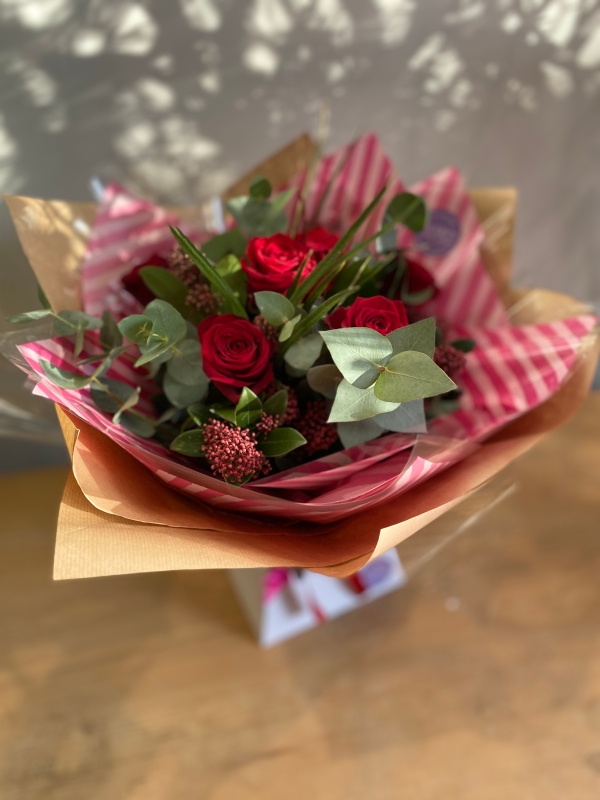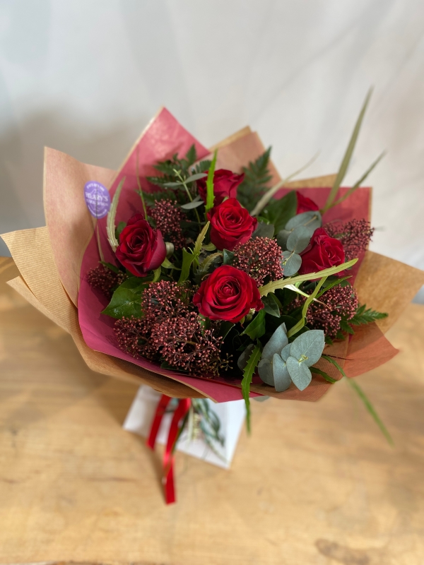 6 beautiful red roses with foliage, beautifully gift wrapped.
