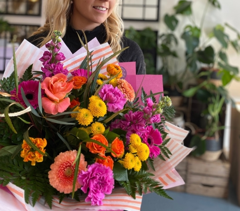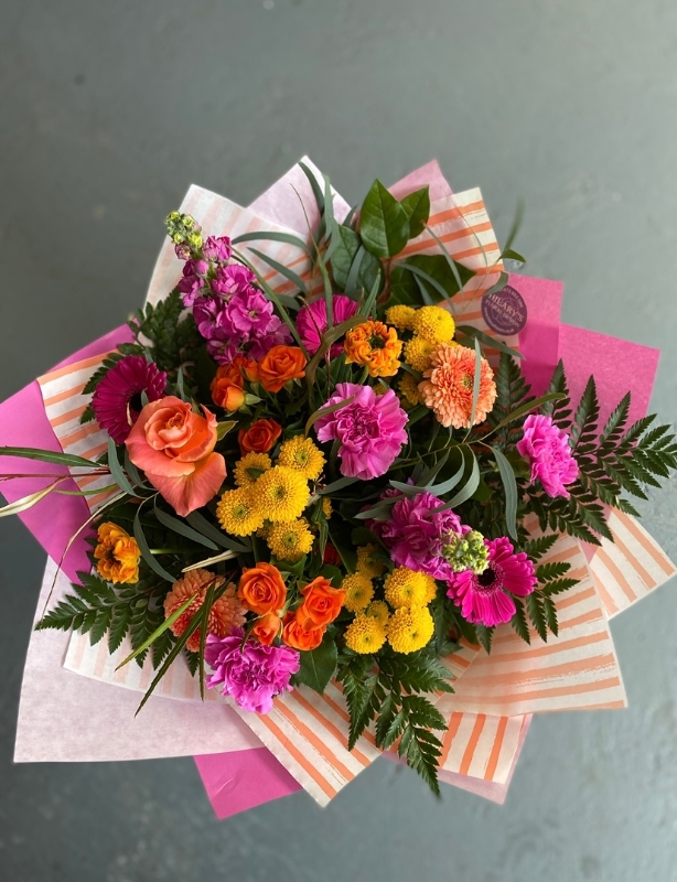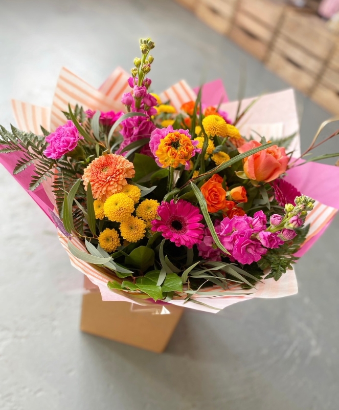 This beautiful Cerise pink, orange and yellow toned bouquet is the perfect blend of seasonal flowers and fresh foliages.
