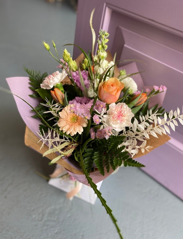 This beautiful light pinks, peach and white toned bouquet is the perfect blend of seasonal flowers and fresh foliage for Mother’s Day.